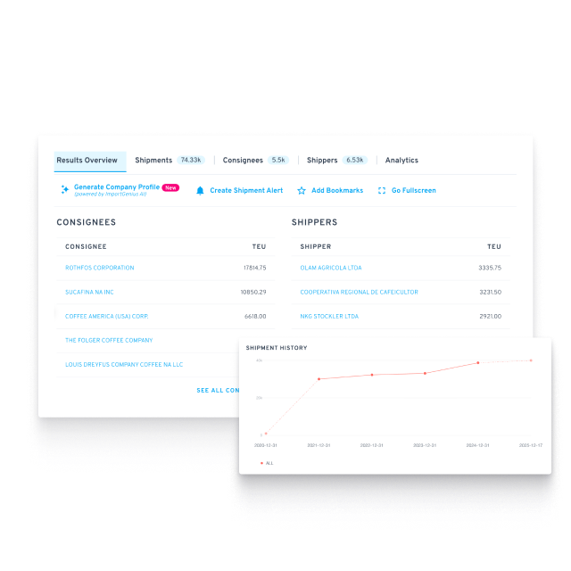 ImportGenius resuelve esto con detalles Envío y seguimiento de contenedores capacidades. Busque por número de contenedor, nombre del buque, código de transportista, conocimiento de embarque, remitente, destinatario, puertos, producto y otros filtros para identificar exactamente lo que necesita. Guarda tus búsquedas, sigue a las empresas o configura alertas de envío para que te avisen en el momento en que una actividad coincidente pase por la aduana.