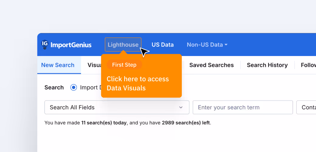 Le service de données Lighthouse d'ImportGenius, accessible depuis la page de recherche principale, fournit des résumés visuels rapides des données commerciales d'importation des États-Unis par volume, produit, pays d'origine, etc.