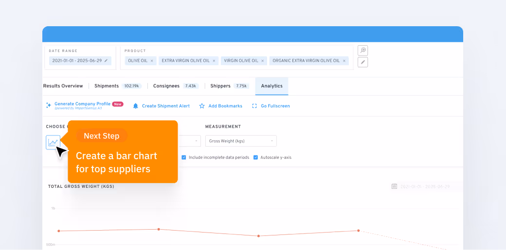 En ventilant ces données globales par fournisseur, l'utilisateur peut voir quelles entreprises détiennent la plus grande part du marché américain d'importation d'huile d'olive. Les données brossent un tableau complet et fiable de la concurrence dans ce secteur, comme dans tout autre secteur. Cela permet aux dirigeants d'identifier les concurrents à croissance rapide et de comparer les performances.