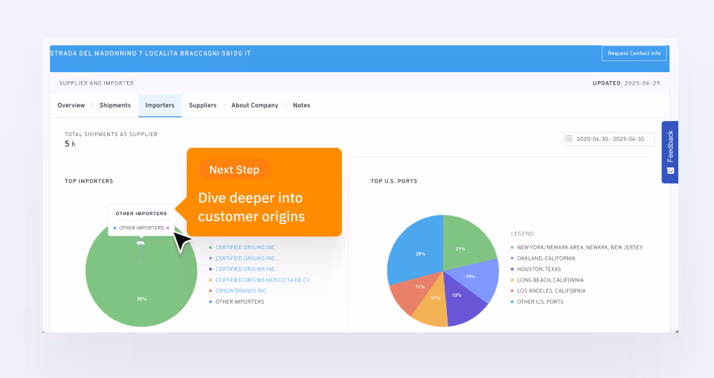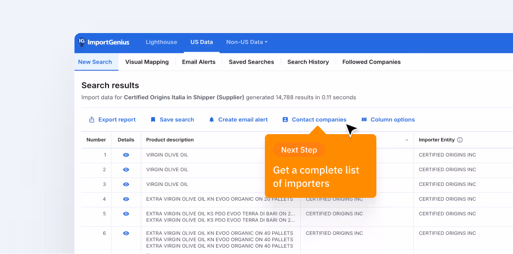 Le profil de l'entreprise ImportGenius pour Certified Origins, une entreprise basée en Italie qui est le deuxième importateur d'huile d'olive en poids total, montre que la société expédie des volumes importants vers plusieurs ports sur toutes les côtes américaines. Il montre également que presque toutes ses expéditions sont destinées à un seul importateur : lui-même. Certified Origins Italia possède une filiale américaine qui réceptionne tous ses envois.