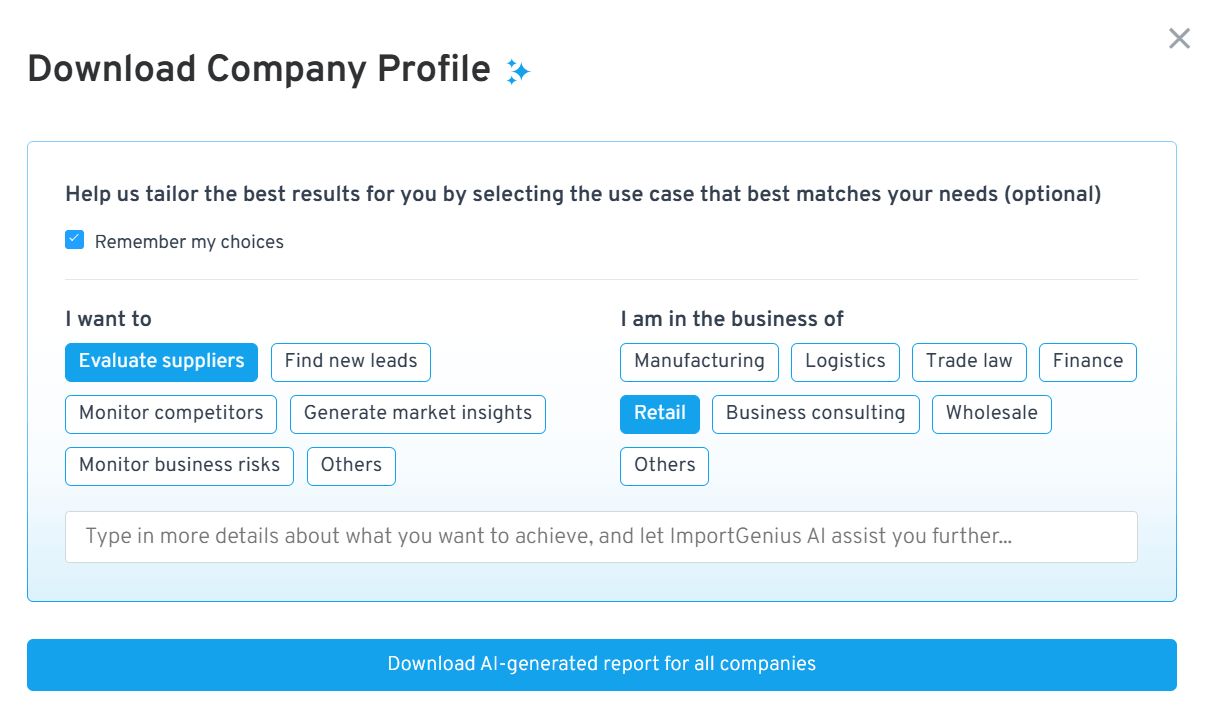 Il s'agit d'un outil alimenté par l'IA qui génère des profils d'entreprise détaillés à partir des données commerciales, de l'historique des expéditions et des archives publiques disponibles.