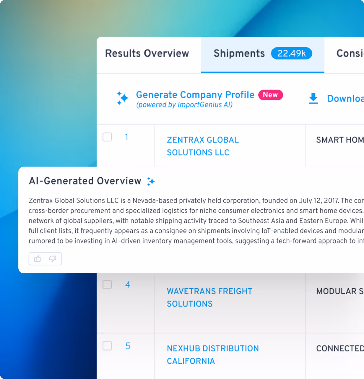 Prenez l'avantage grâce à des données commerciales en temps réel et à des informations exploitables. Rejoignez des milliers de transitaires qui utilisent ImportGenius pour identifier de nouvelles opportunités, garder une longueur d'avance sur vos concurrents et conclure davantage de transactions.