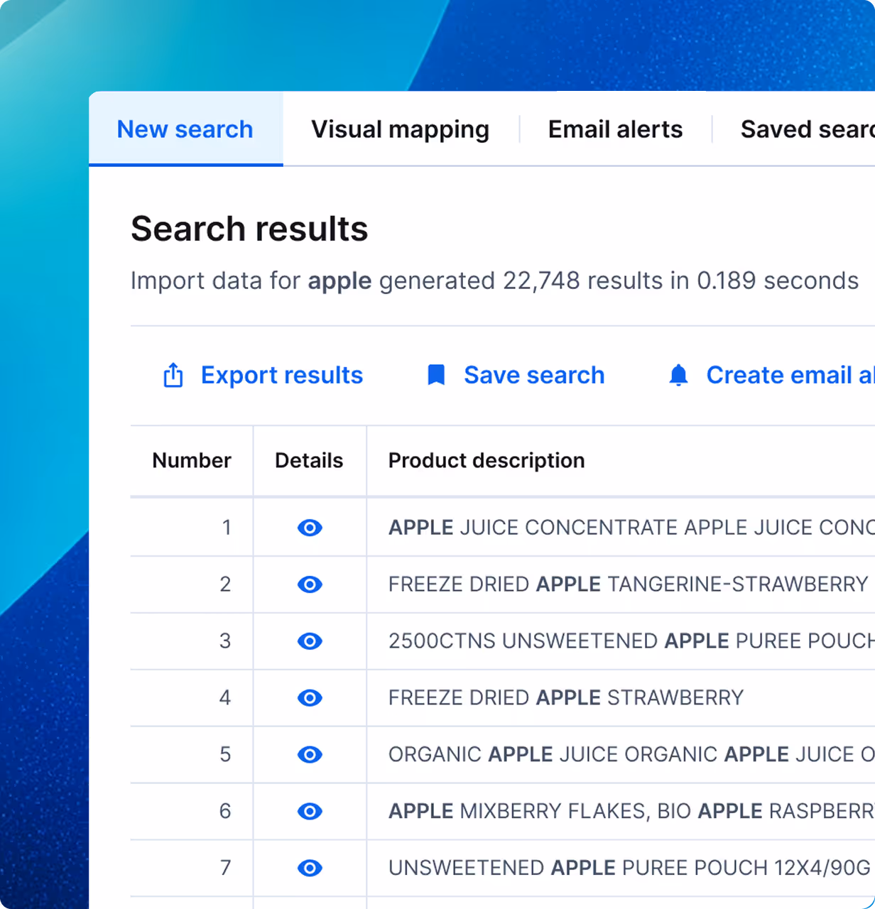 Recherchez les dossiers douaniers mondiaux par produit, marque, code HS ou voie d'expédition. Suivez en direct les activités des importateurs et des exportateurs qui font des affaires. Découvrez la demande en temps réel.