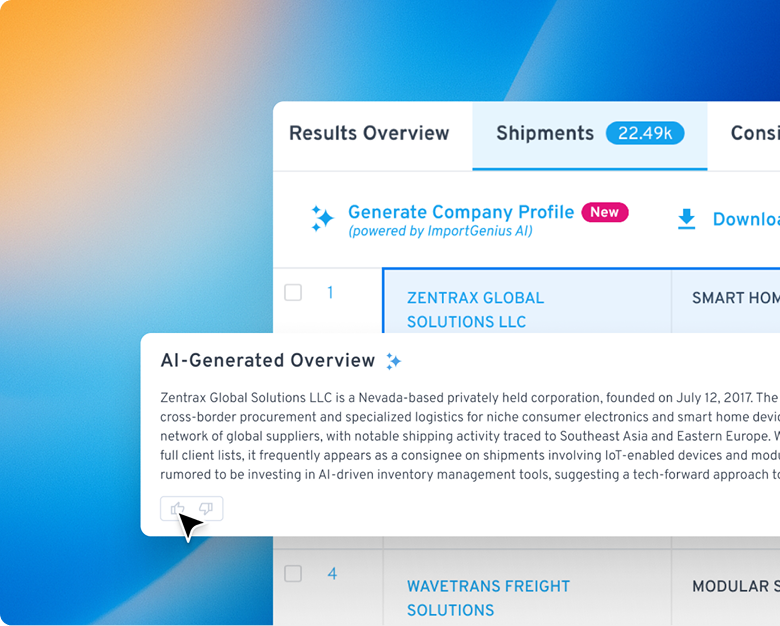 Nous ne proposons pas d'essais gratuits, mais vous pouvez essayer notre plateforme tout en continuant à accéder à nos fonctionnalités d'IA, y compris nos Profileur d'entreprise Genius et Recherche par code HS avec notre plan USA Pro. Ce plan est proposé de mois en mois sur notre site Web.